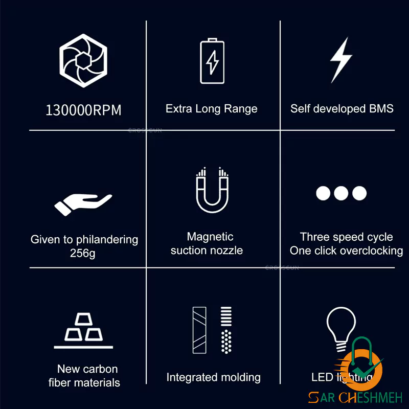 | حالت سرعت | چهار حالته (حالت اول 30 هزار rpm، حالت دوم 60 هزار rpm، حالت سوم 80 هزار rpm و حداکثر سرعت 130 هزار rpm) |